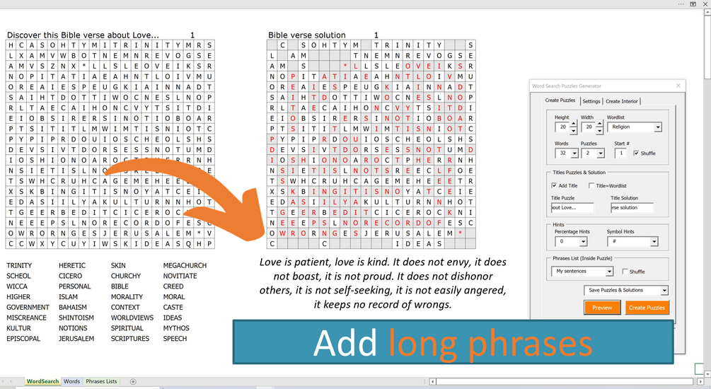 This word search puzzle generator in Excel* creates an unlimited amount of unique puzzles that you can save in bulk on your computer. The tool can also insert all generated puzzles into PowerPoint, in bulk and export it as a single pdf-file, ready to print or directly upload to KDP