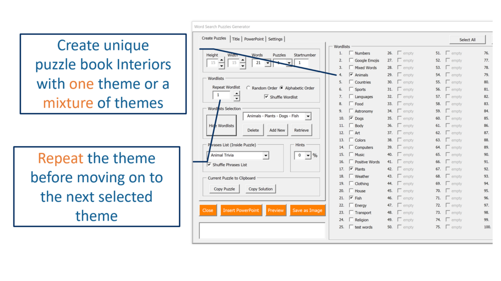 This word search puzzle generator in Excel* creates an unlimited amount of unique puzzles that you can save in bulk on your computer. The tool can also insert all generated puzzles into PowerPoint, in bulk and export it as a single pdf-file, ready to print or directly upload to KDP