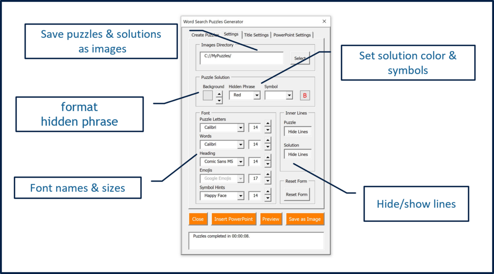 * Create puzzles with a Hidden Message inside the puzzlegrid!