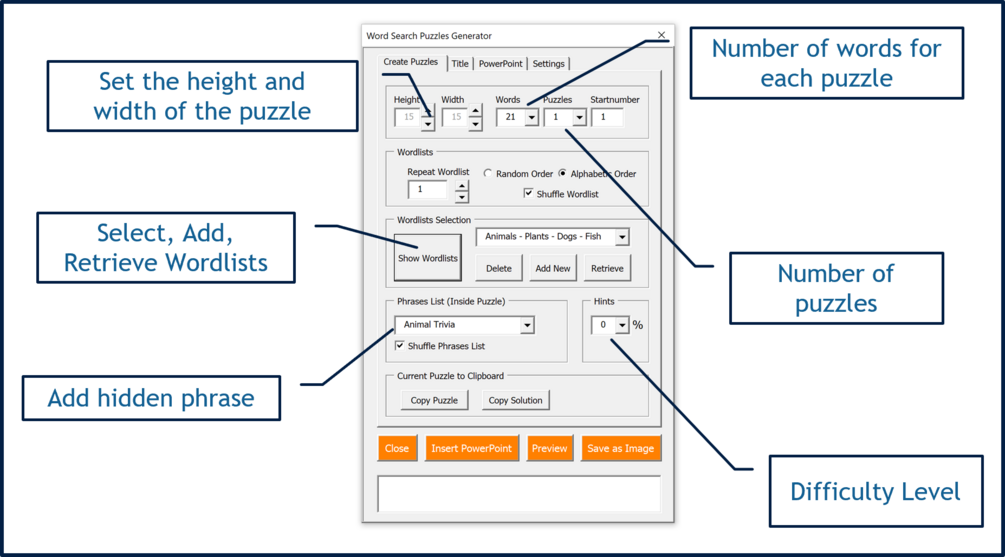 This word search puzzle generator in Excel* creates an unlimited amount of unique puzzles that you can save in bulk on your computer. The tool can also insert all generated puzzles into PowerPoint, in bulk and export it as a single pdf-file, ready to print or directly upload to KDP
