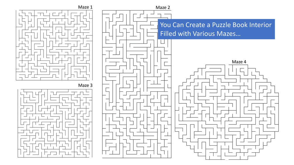This Maze Generator in Excel creates an almost unlimited amount of unique mazes which can be inserted in your book interior and printed as pdf and directly uploaded to Kindle Direct Publishing (KDP). You can mix and combine different mazes and different sizes inside a book making each and every book unique!