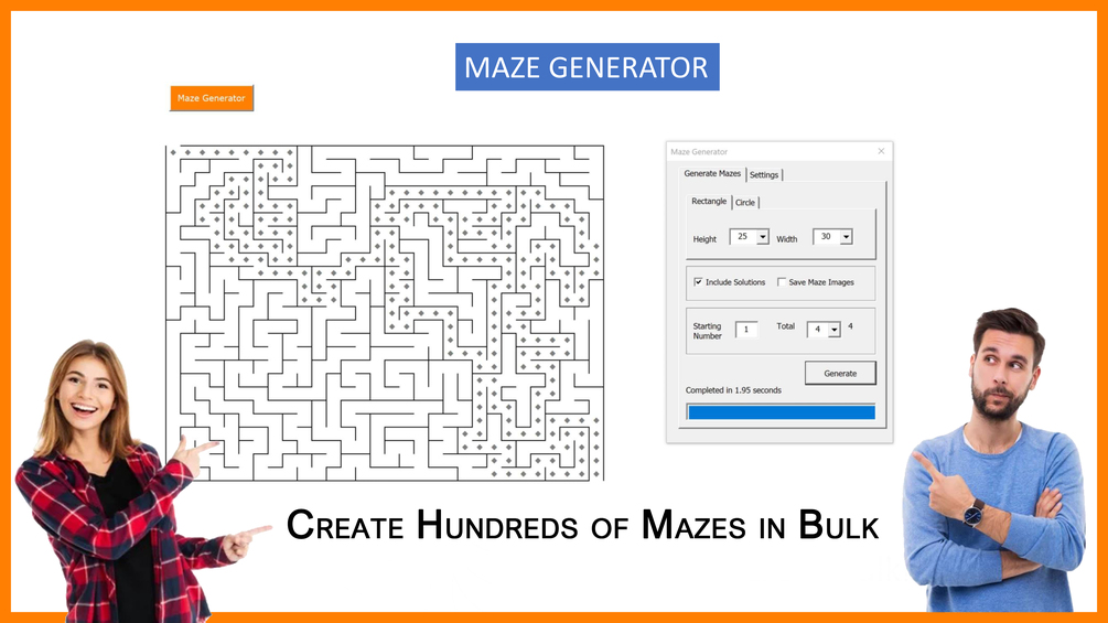 This Maze Generator enables you to create unique mazes of different size in bulk with Excel within a few minutes!